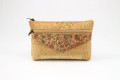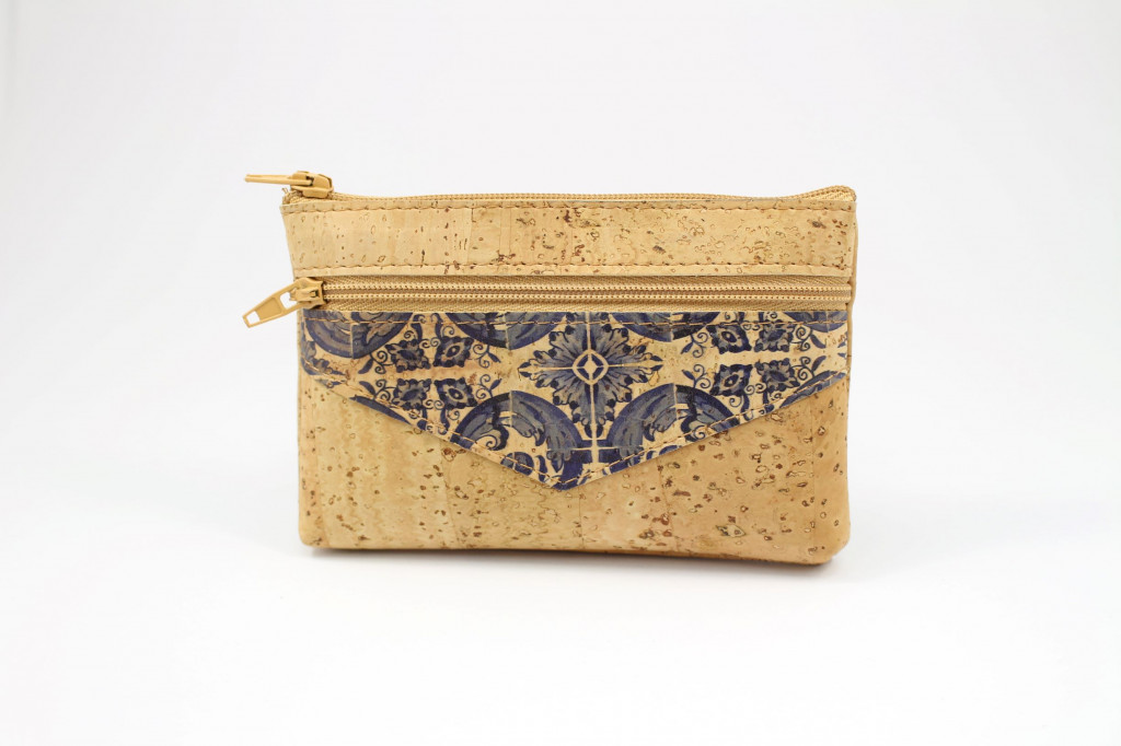 Bolsa porta-moedas de cortiça impressa com padrão colorido, com formato retangular com fecho de correr. Bolso exterior à frente com fecho de correr.