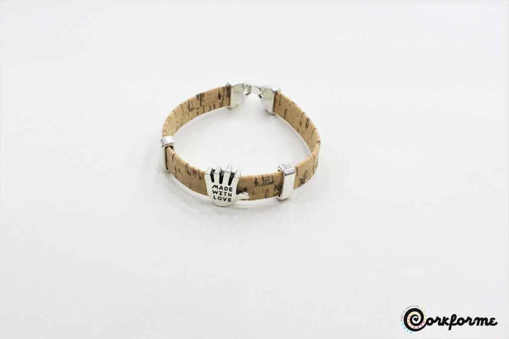 Bracelet in ribbon Cork with an application in metal with a hand eats description "Made in Love."