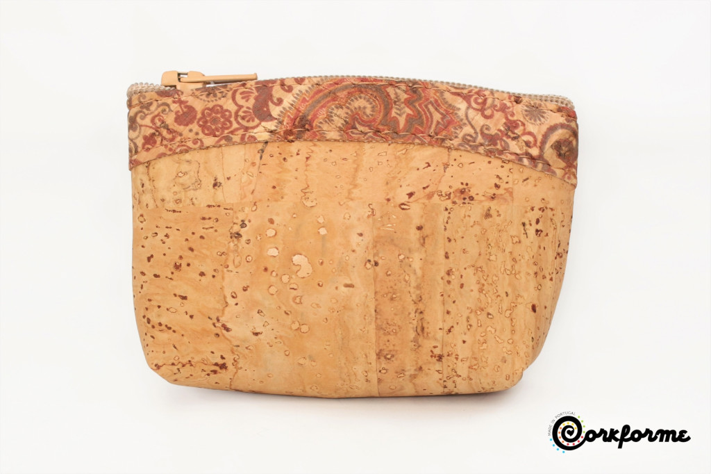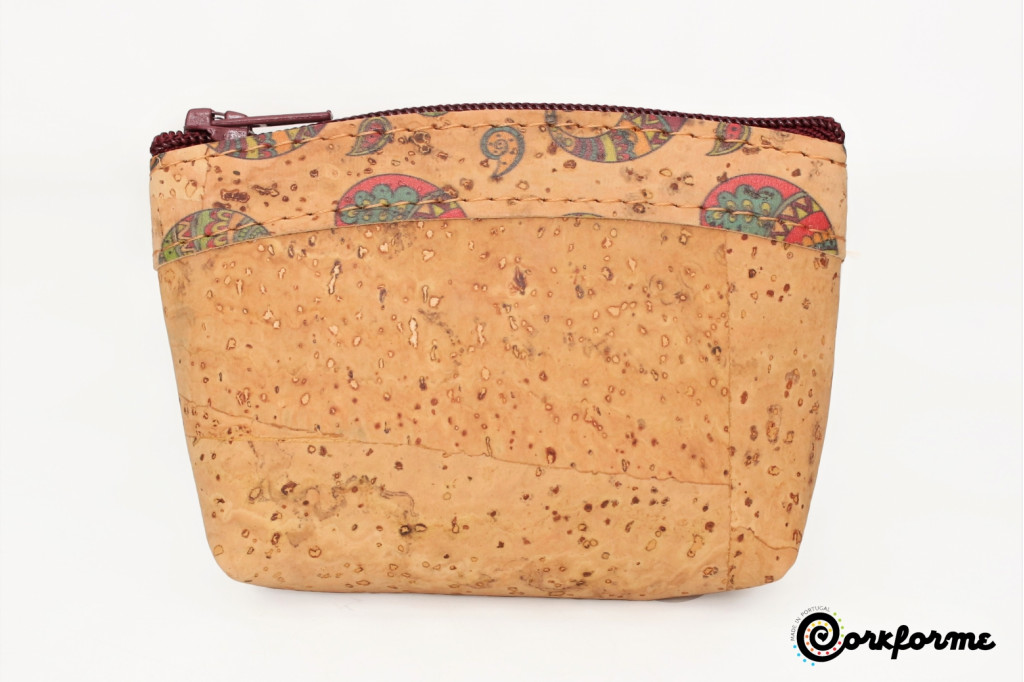 Cork coin purse printed with a colorful pattern, round in shape and with a zipped compartment.