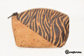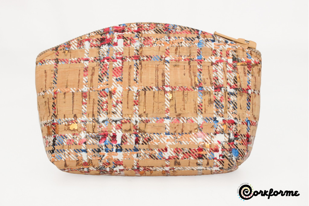 Cork coin purse printed with a colorful pattern, round in shape and with a zipped compartment.